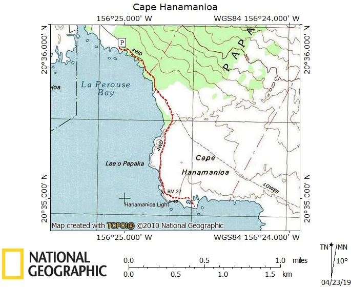 Hike: This hike begins at La Pérouse Bay, named for the French explorer Jean François de Galaup, comte de Lapérouse, who was the first European to anchor near Maui in 1786. The trail follows the coast where you’ll find a few spots containing a bit of sand between lava features. You’ll notice rock walls in the area. This site was a village named Keone’ō’io, “the sandy place with bonefish.” Stay on the trail and off of any remaining rock walls. The trail passes through an area of overgrown Kiawe trees near the shoreline. You’ll probably see several feral goats. After passing through the Kiawe forest, you’ll come to a barren expanse of lava. The Hoapili Trail branches off to the east, marked by several metal signs warning visitors to remain on the trail and out of any ancient sites. Stay on the old road you’ve been using and stay near the shoreline. The trail eventually enters sparse lava, and you’ll be about 30 feet above sea level. There are several spur trails toward the ocean that provide nice vantages. Be extremely careful on these eroding cliffs. Cape Hanamanioa has a large white nautical warning device. Pass this “lighthouse” and find a faint trail through the rough lava that descends down to the coral beaches on the eastern side of the Cape. Pass by an anchialine pool and keep away from it. Enjoy the pretty coral beach and return the way you came.